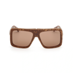 La montatura si presenta con una forma mascherina squadrata, pulita e geometrica, che dona struttura allo sguardo. Il frontale in marrone chiaro è impreziosito da trame interne raffinate, simili alla lavorazione di una maglia, che aggiungono profondità e personalità al design.