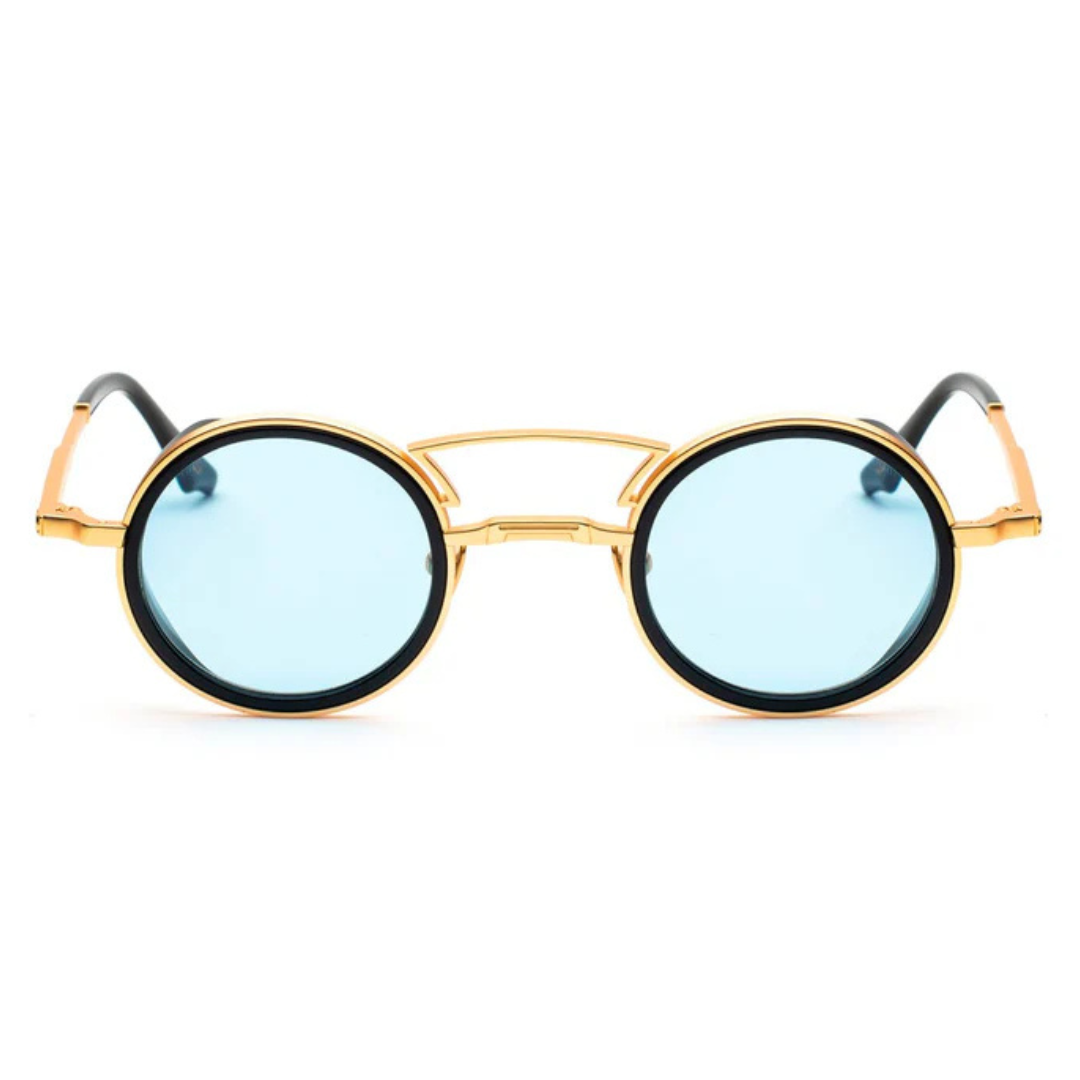 Realizzata con una raffinata combinazione di titanio color oro e inserti in acetato nero, la struttura esprime un’eleganza decisa ma mai eccessiva. Il metallo dorato illumina il design con una nota preziosa, mentre il profilo in acetato crea profondità e contrasto, valorizzando la forma rotonda della montatura e rendendola ancora più distintiva.