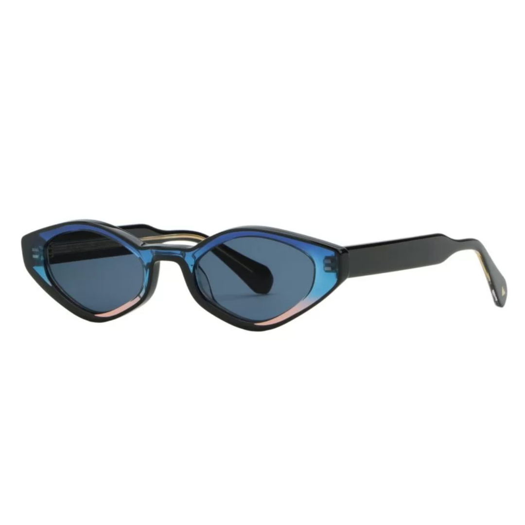 La struttura presenta un interessante gioco di contrasti cromatici: il frontale combina tonalità scure con sfumature blu traslucide, creando profondità e riflessi sofisticati che cambiano a seconda della luce. Questo effetto sfumato rende l’occhiale particolarmente originale e ricercato, perfetto per chi desidera un accessorio fuori dagli schemi ma comunque elegante.