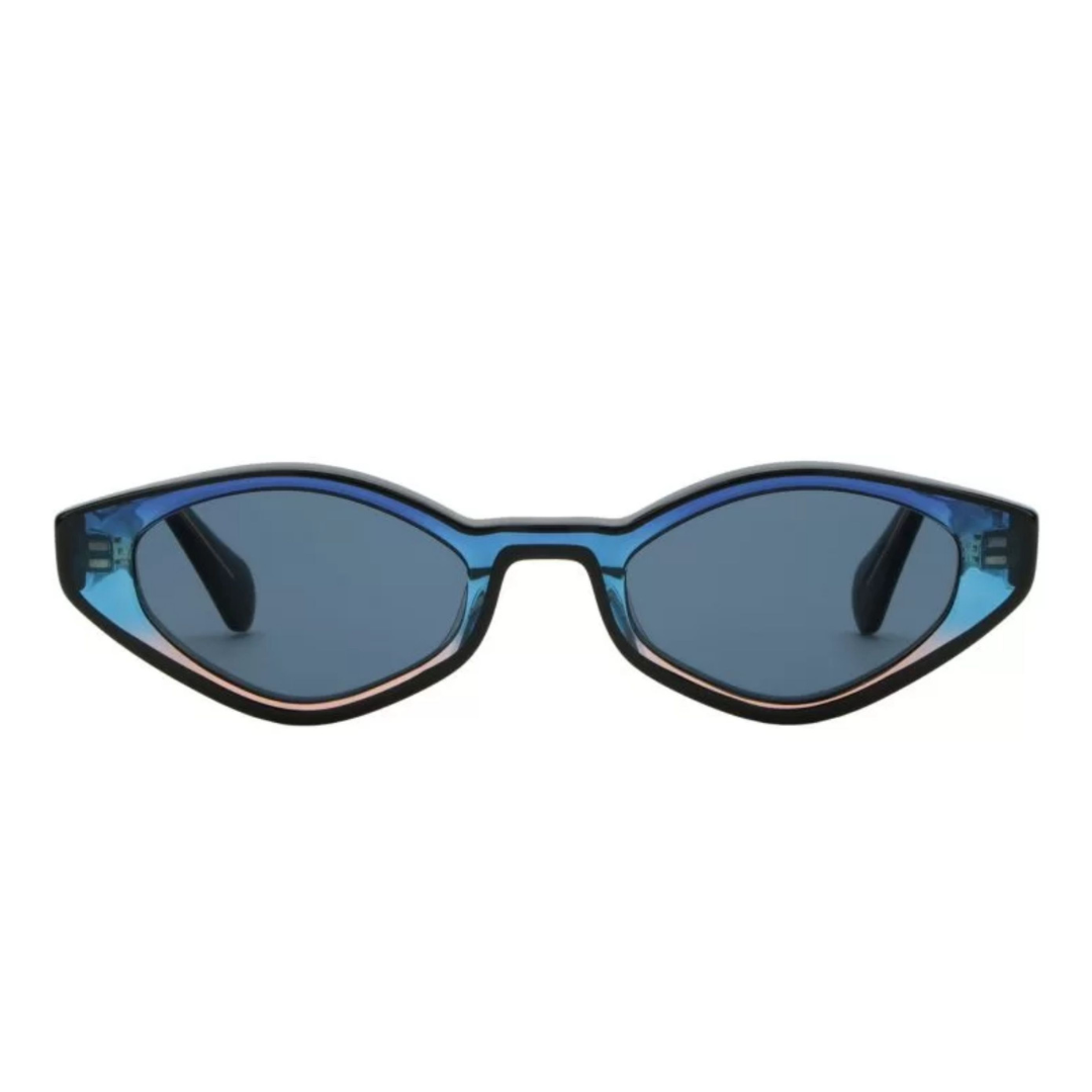 Le lenti, in una tonalità coordinata tendente al blu, offrono una protezione efficace dai raggi solari e contribuiscono all’armonia estetica del modello. La loro forma allungata e leggermente appuntita enfatizza l’ispirazione vintage, reinterpretata però con un approccio contemporaneo e di tendenza.